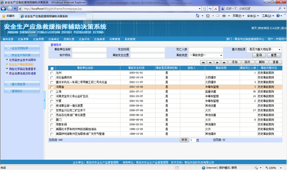 以醒目的報表形式,對重大危險源分布、監(jiān)管企業(yè)、危險物質(zhì)、應(yīng)急資源進(jìn)行統(tǒng)計(jì)列表展示,并支持多層次頁面鏈接方式查詢與瀏覽重大危險源、企業(yè)綜合信息,支持鉆取功能。并在此基礎(chǔ)上進(jìn)行數(shù)據(jù)挖掘和深入分析,查詢結(jié)果既可以顯示為原始的文本數(shù)據(jù)也可以分類統(tǒng)計(jì)總和,提供柱狀、餅狀等各種形式的圖形。