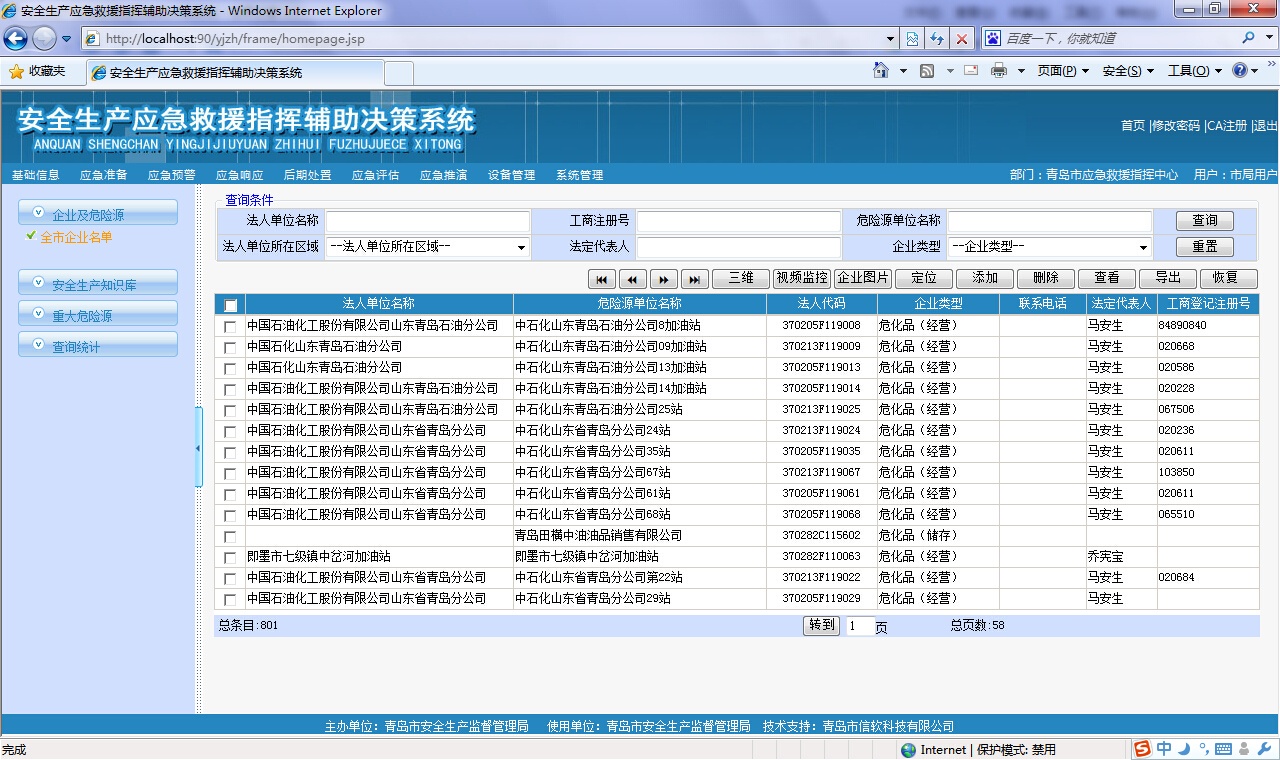 ? 對存在危險源的企業(yè)進行管理和查詢,可以按地區(qū)、經(jīng)濟類型、所屬行業(yè)等支持多種查詢條件進行綜合查詢,查詢結(jié)果提供企業(yè)和所屬危險源的具體信息、以樹形結(jié)構(gòu)展示單位基本情況、及其附屬的安全評價、行政許可等分類信息,方便政府主管部門查看危險源企業(yè)的各種動態(tài)情況??梢栽诰€查詢調(diào)閱危險源視頻監(jiān)控信息、三維模型信息、GIS詳細信息,企業(yè)及危險源信息可以導(dǎo)出到excel或者word中。