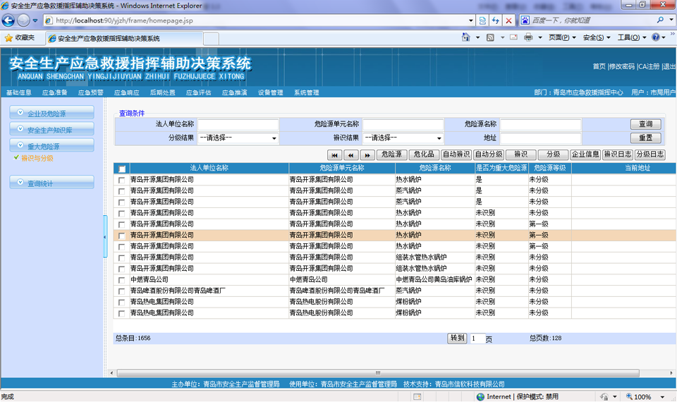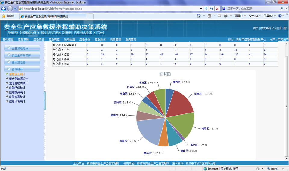 以醒目的報表形式,對重大危險源分布、監(jiān)管企業(yè)、危險物質(zhì)、應(yīng)急資源進行統(tǒng)計列表展示,并支持多層次頁面鏈接方式查詢與瀏覽重大危險源、企業(yè)綜合信息,支持鉆取功能。并在此基礎(chǔ)上進行數(shù)據(jù)挖掘和深入分析,查詢結(jié)果既可以顯示為原始的文本數(shù)據(jù)也可以分類統(tǒng)計總和,提供柱狀、餅狀等各種形式的圖形。