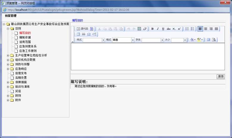 應(yīng)急預(yù)案有綜合應(yīng)急預(yù)案、專項應(yīng)急預(yù)案、現(xiàn)場處置方案構(gòu)成,由于綜合預(yù)案、專項預(yù)案、現(xiàn)場處置預(yù)案的目錄和編制內(nèi)容并不相同,在編制預(yù)案時,編制人員可隨時讀取預(yù)案模板或案例進行參考,系統(tǒng)并可提示幫助信息,輔助完成預(yù)案的編制、修訂。