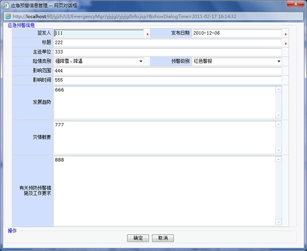 根據(jù)青島市發(fā)布的預(yù)警信息并結(jié)合安監(jiān)局業(yè)務(wù),提前發(fā)布一些預(yù)警信息或通過電話、傳真、手機、短信等方式,獲取預(yù)警信息。預(yù)警信息需要根據(jù)事態(tài)的進一步發(fā)展核實后,根據(jù)系統(tǒng)權(quán)限,向應(yīng)急事件可能涉及的區(qū)域發(fā)布,當(dāng)預(yù)警結(jié)束后解除預(yù)警。