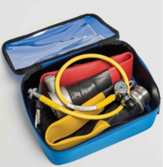 充氣管道救援套組的設(shè)計和開發(fā)旨在提供一種簡單而有效的方式,使用標準長度的消防水帶提供下游安全吊臂或浮動救援輔助設(shè)備。充氣管道救援套組充氣系統(tǒng)可使消防水帶兩端密封,尾部帶2個密封件,公頭末端為黃色,以便清晰識別并在使用時增加可視性。該系統(tǒng)的工作壓力為1.5巴,并使用系統(tǒng)提供的充氣套件進行充氣,該系統(tǒng)配有預(yù)設(shè)3.5巴的壓力調(diào)節(jié)器。母頭的尾巴