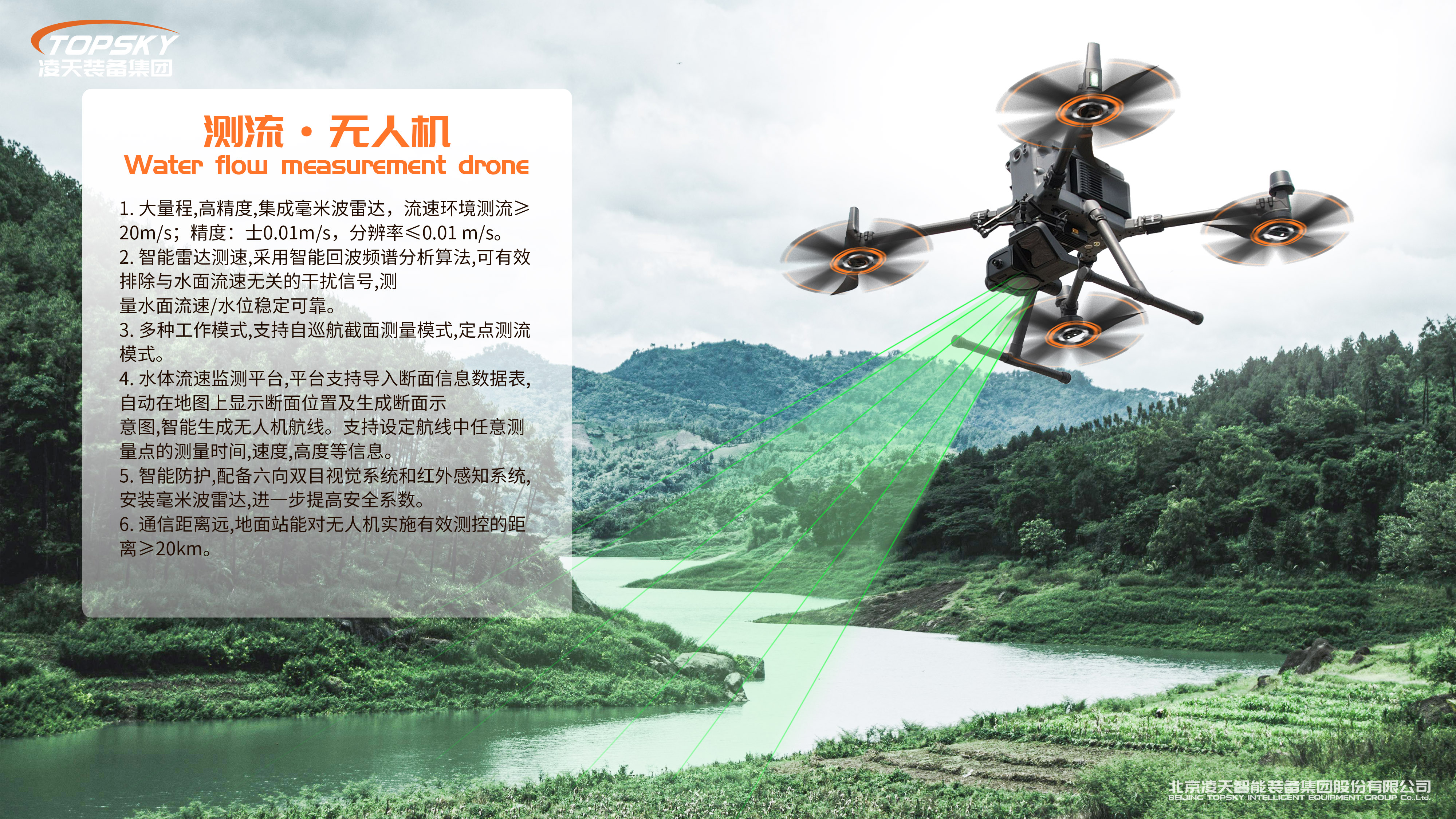 測(cè)流無(wú)人機(jī)具備水體流速、流量監(jiān)測(cè)等系統(tǒng);用于暴雨洪水流動(dòng)速度,特別是堤防潰口水流速度的快速探測(cè)。具備無(wú)人機(jī)水體流速、流量的監(jiān)測(cè)系統(tǒng),流速環(huán)境測(cè)流≥20m/s。