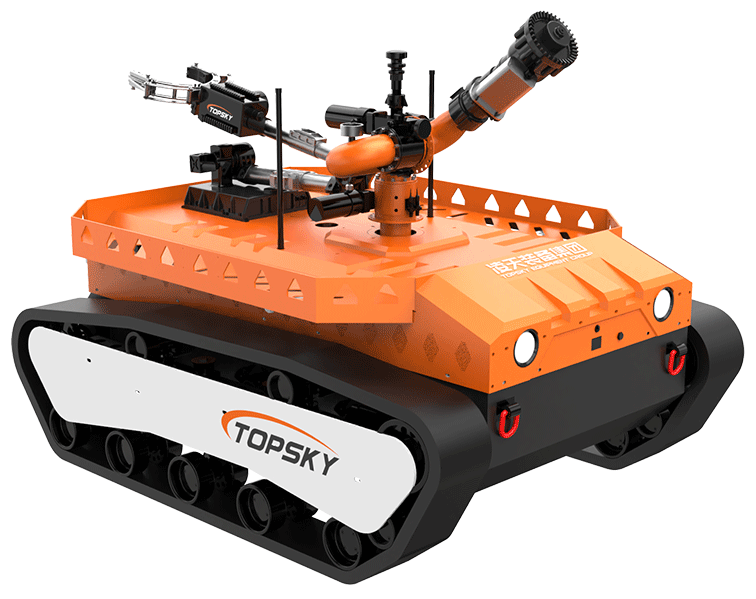 履帶式防爆機器人底盤采用鋰電池電源作為動力源,使用無線遙控的方式遠距離操控,裝載7自由度排爆機械手能實現不同角度旋轉,機械臂可裝載爆炸物銷毀器,可現場摧毀爆炸物,采用履帶+單擺臂結構,能適應各種地形快速作戰(zhàn)部署。