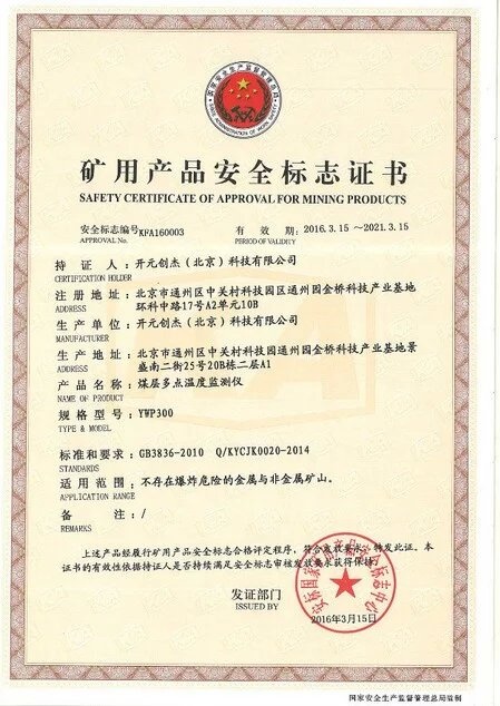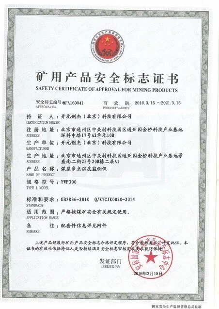 YWP300煤層多點(diǎn)溫度檢測儀取得安標(biāo)認(rèn)證