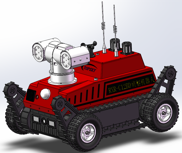 底盤采用全地形設(shè)計(jì),即前后4擺臂+履帶+金屬輪胎的三合一底盤結(jié)構(gòu),能適應(yīng)各種地形快速作戰(zhàn)部署,用于代替救援人員進(jìn)入復(fù)雜環(huán)境、危險(xiǎn)場(chǎng)地的機(jī)器人,對(duì)環(huán)境進(jìn)行視頻采集,監(jiān)測(cè)有害氣體濃度、輻射強(qiáng)度等數(shù)據(jù),實(shí)時(shí)傳輸至指揮中心,以便掌握現(xiàn)場(chǎng)境況,及時(shí)采取有效