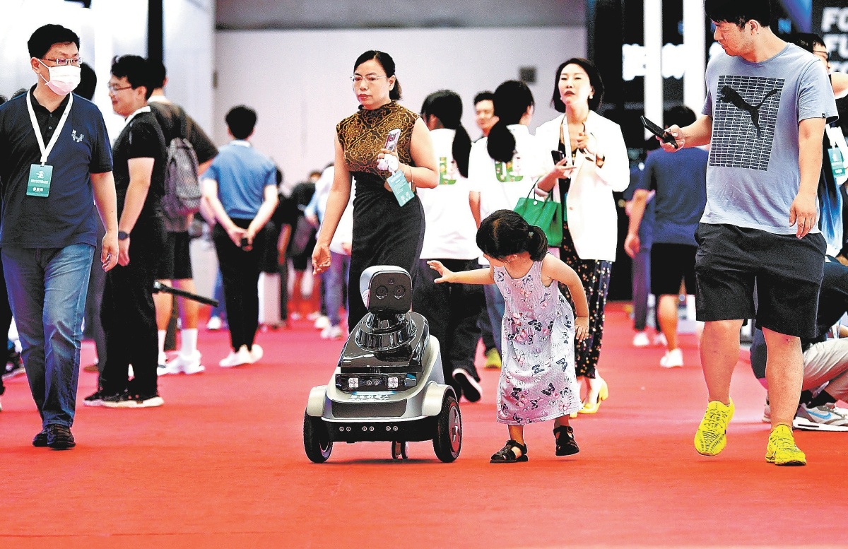 小觀眾在展覽現(xiàn)場偶遇場地內(nèi)的機器人,兩者熱情互動。(攝影:和冠欣)