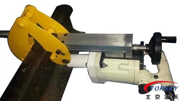鋼軌鉆由主機、雙重斷水保護裝置、進口硬質(zhì)合金鋼軌鉆頭、凈化器、張緊裝置等組成,液壓膠管總成將氣源和主機連接起來,經(jīng)過凈化的氣源提供的氣壓驅(qū)動鋼軌鉆投高速鉆進,進行切割。灑水冷卻噴頭和雙重斷水保護裝置起到冷卻和降塵的作用,保護機器正常運轉(zhuǎn)。