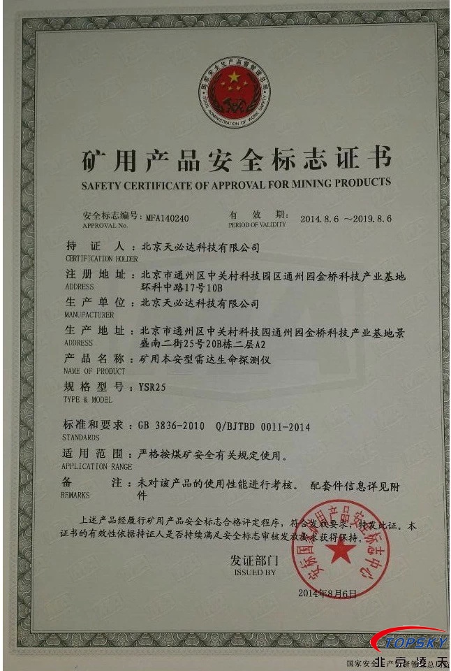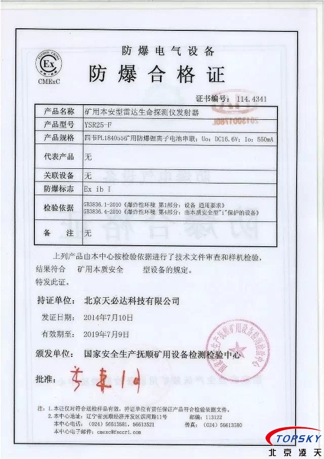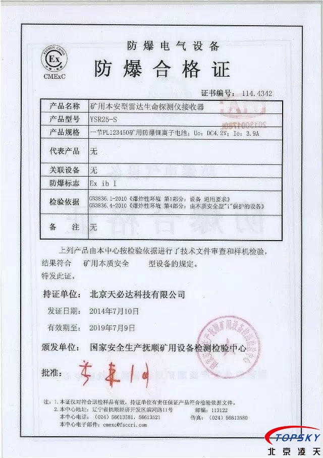 從國(guó)家安標(biāo)中心獲悉,YSR25本安型雷達(dá)生命探測(cè)儀取得煤安標(biāo)志認(rèn)證(證書(shū)見(jiàn)下圖),自此,國(guó)內(nèi)本安型可用于爆炸性環(huán)境的探人雷達(dá)取得完整下井資質(zhì),從研制方獲悉,該設(shè)備已在山西陽(yáng)泉煤業(yè)集團(tuán)救護(hù)大隊(duì)、山西潞安集團(tuán)救護(hù)大隊(duì)、開(kāi)灤集團(tuán)救護(hù)大隊(duì)進(jìn)行過(guò)工業(yè)性試驗(yàn),試驗(yàn)效果良好,探測(cè)距離達(dá)到25米(報(bào)告見(jiàn)下圖)!