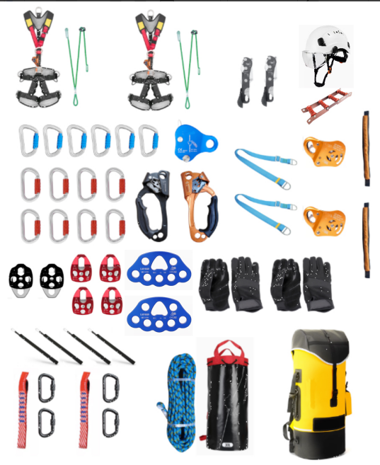 用于輔助救援人員進(jìn)行攀爬以及搭建救援通道搶救和運送傷員。包含繩索手套、山岳救援頭盔、頭燈、護(hù)目鏡、全身式安全吊帶、安全繩、安全鉤、上升器、抓繩器、下降器、滑輪、連接帶、 緩沖器等。