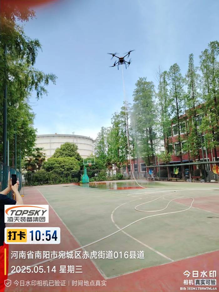 該無人機可裝載在消防車上,能快速啟動升空,通過特制高壓水帶與消防車水罐連接,消防車水罐內(nèi)部高效泡沫/水基滅火劑輸送到無人機平臺,在水槍噴口水平噴射出去,達到滅火的效果。