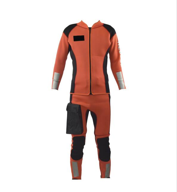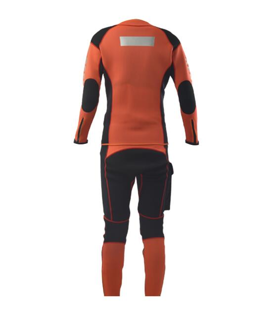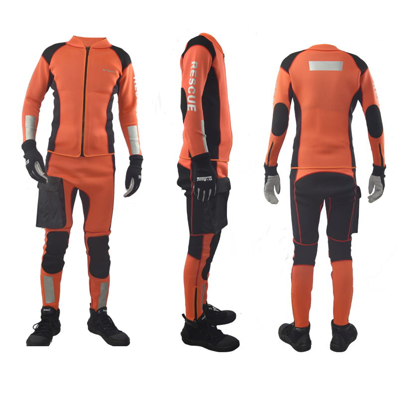水域救援專用分體式濕式服,前開拉鏈長袖上衣和中腰褲兩件套。3mm高彈氯丁橡膠面料制作,相拼3mm超彈氯丁橡膠面料,有效的提升運動的自由度。無極調(diào)節(jié)尼龍戰(zhàn)術腰帶和高強度塑鋼插扣,防止衣服滑落。右腿外側(cè)設有一個防水尼龍面料立體口袋,臀部一片式、護膝、護肘易摩擦部位,均采用彈性聚酯纖維復合面料,增加救援服的耐磨性。衣袖、褲口及背后都設有彈性反光帶。領口、袖口及褲口處YKK拉鏈開合。