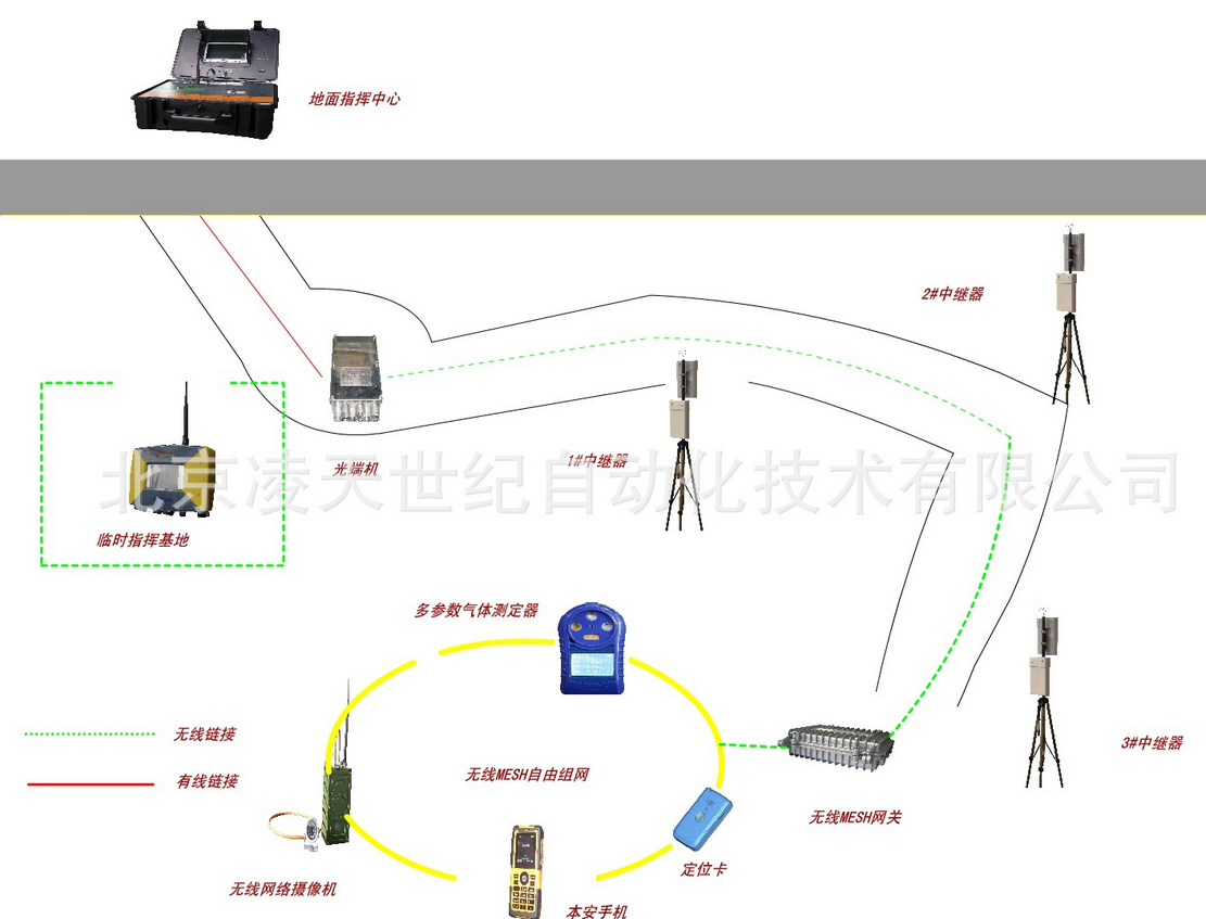 它不需要依賴管道等介質(zhì),不同與泄露通信,特別適合于搶險救災(zāi),與國內(nèi)外同類產(chǎn)品相比。該裝置輕巧便攜,能在隧道、地下建筑和復(fù)雜建筑群的地方無線傳送語音和災(zāi)區(qū)環(huán)境信息。無線發(fā)射器及攝像頭,由救護(hù)隊員隨身攜帶,它可以實時地將現(xiàn)場的音視頻信息傳輸?shù)交?,基站再將信號傳到地面指揮中心。井下災(zāi)區(qū)的救護(hù)隊員、井下救援基地和地面指揮中心之間可進(jìn)行實時信息溝通,救援全過程的圖像、語音資料可完整儲存并回放,為今后進(jìn)行事故原因分析、總結(jié)搶險救災(zāi)經(jīng)驗教訓(xùn)提供基礎(chǔ)資料。若同時連接互聯(lián)網(wǎng),救援指揮中心及指導(dǎo)專家可實時了解災(zāi)區(qū)救援情況。