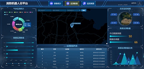 消防機(jī)器人云平臺集機(jī)器人分布、機(jī)器人統(tǒng)計、視頻、氣體、語音、控制等集成于一體,做到全局把控、機(jī)器人監(jiān)測、全生命周期綜合使用及可視化操作。當(dāng)遇到突發(fā)事件時,能在線直觀的分析并高效的了解到設(shè)備實時狀態(tài)。