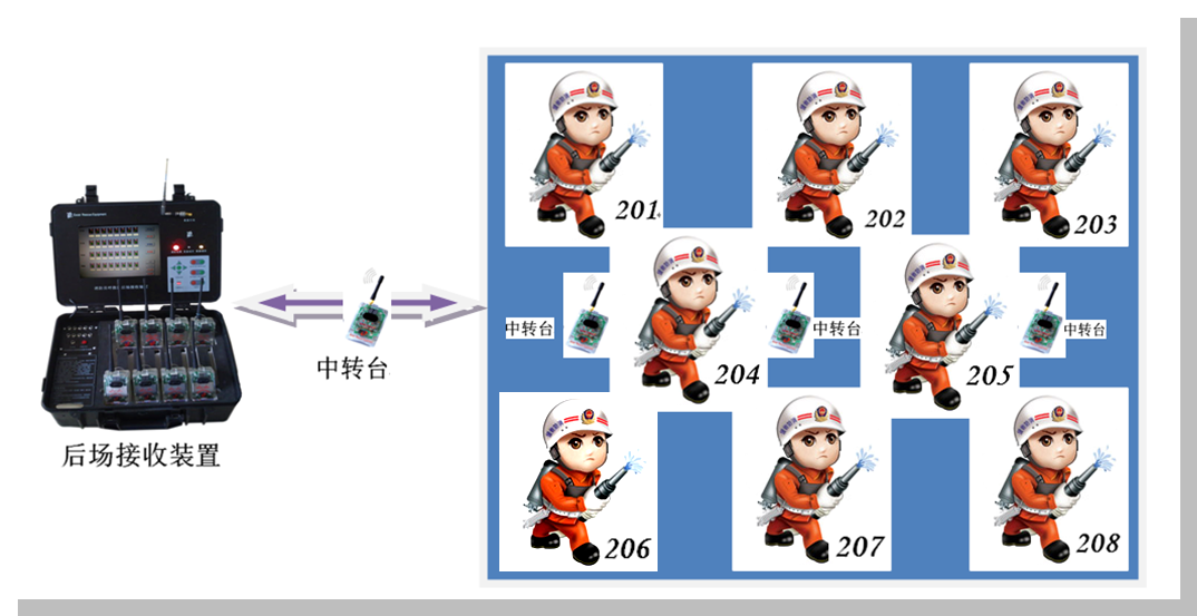 指揮員可根據(jù)監(jiān)視的情況,發(fā)出單呼巡查,群呼巡查,單呼撤退,群呼撤退的指令。呼救器佩戴人員可實(shí)時(shí)接收指令,通過(guò)聲響提示查看巡查和撤退的狀態(tài),實(shí)時(shí) 互動(dòng)回應(yīng),為指揮員直觀判斷現(xiàn)場(chǎng)的情況,提供非??煽康闹笓]依據(jù)。該設(shè)備配套的呼救器具有遠(yuǎn)距離數(shù)據(jù)通信功能,具有群組獨(dú)立使用的功能。其中一個(gè)呼救器報(bào)警,群組呼救器都能有聲響提示,顯示報(bào)警的編組編號(hào),兼有現(xiàn)場(chǎng)指揮員主呼撤退的功能。每套產(chǎn)品編組顯示:1-4組,每組編號(hào)顯示:1-8人 ,每套最大使用數(shù)量32人,可編不同ID套數(shù):40套,可編不同組號(hào):160組,可編不同ID號(hào):1280個(gè)編號(hào) 。