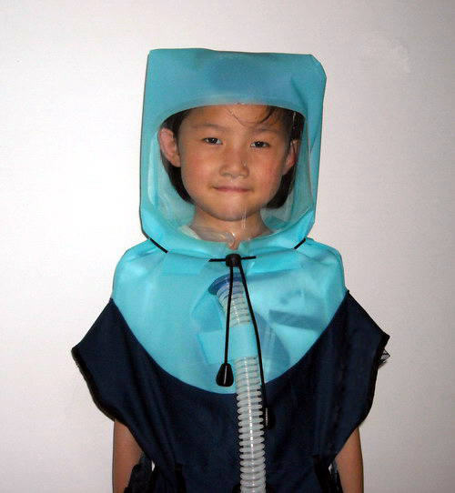 適合兒童(3—8歲)使用,為有效回避戰(zhàn)爭毒氣或有害環(huán)境而設計的防毒面罩。利用送風機將外部空氣通過濾毒罐送入頭罩內,形成密閉正壓,使得呼吸方便,活動無不適現(xiàn)象。