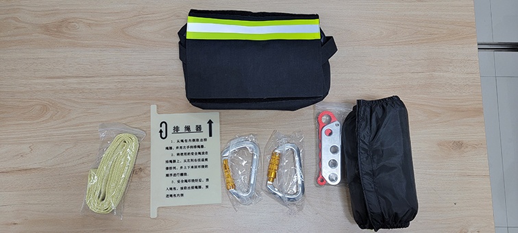 套裝構(gòu)成:1根安全繩,2個安全鉤,1個下降器,1根扁帶,1個排繩器,1塊包繩布,1個多功能阻燃繩包。